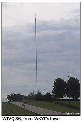 Bidding Jerry farewell, we head off under darkening skies to spend one final hour in Lexington, on track to a lunch appointment in Cincinnati (more on that in a bit!) Circling the ring road on the east side of town, we pass the WBUL tower and turn off on US 60, Winchester Road. We're soon within sight of two tall TV towers, starting on the left, just past I-75, at 2851 Winchester Road and the stately studio of WKYT (Channel 27), the CBS affiliate for Lexington. We admire the topiary on the lawn that spells out "WKYT 27," as well as the tall tower that holds WKYT and Citadel AC outlet WVLK-FM (92.9), then look to the east to see the equally tall stick of ABC affiliate WTVQ (Channel 36).