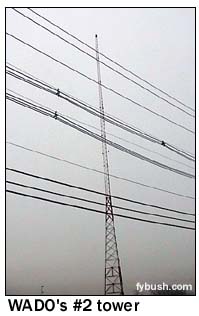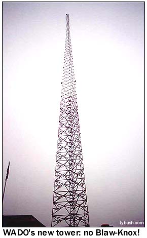 It's radio history for several reasons, beginning with a legacy that dates back at least to February 13, 1934, when stations WAAM Newark and WODA Paterson, which had been sharing time on 1250 kHz (along with a third station, WHBI Newark), joined forces to become "New York's newest radio station," WNEW, operating from this very site on Paterson Plank Road in Carlstadt, N.J., using a transmitter that had belonged to CBS flagship station WABC (860, now WCBS 880) at its old site in Wayne, N.J. (Your editor believes that WAAM, at least, may have already been using this site before becoming WNEW, but has yet to find confirmation.) As WNEW, the station on 1250 was a true radio pioneer, giving birth to the disk jockey (in the person of Martin Block's "Make Believe Ballroom") and to all-night programming (Stan Shaw's "Milkman's Matinee"), all emanating from this Blaw-Knox diamond tower. In March 1941, WNEW moved to 1280, and that December switched facilities with station WOV, which had just moved to 1130 kHz from a site a few miles south in Kearney, N.J. On this 1280 signal, WOV gave New Yorkers almost two decades of black, Italian and country music programming before being sold in 1959 and becoming WADO. In 1962, WADO bought out WHBI, which had continued to operate Sundays on 1280 for years, and became full-time, changing formats to Spahish-language full-service. And that's what WADO has been ever since, more or less - at least where programming is concerned. But now the picture shown above is history in another way. When I took it in 1998, this was one of six sites around the country that used a Blaw-Knox diamond-shaped tower. The others were WFEA in Manchester, N.H.; WBNS in Columbus, Ohio; WBT in Charlotte, N.C. (three of them in a row, although they're recent reproductions after a storm destroyed the originals); WLW in Cincinnati and WSM in Nashville.