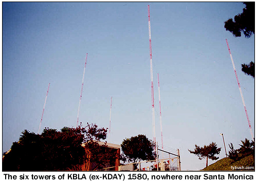 So how lucky are we to have a whole batch of pictures from a few days spent driving around Los Angeles last August? You decide... Our tower visits began just a couple of hours after our plane landed at LAX, as we headed to a Dodgers game at Chavez Ravine (visiting ballparks is a regular addition to the big tower chases, you know...) Before we pulled into the ballpark, we had to make a stop on the hillside overlooking the ravine, just north of downtown L.A., where we found the six-tower array you see at left. It's home to the 50,000-watter at 1580 on the Southern California dial, long known as KDAY and pumping out urban music. KDAY, and its current successor, KBLA, called Santa Monica their city of license, but it's a good 20 miles from here to the pier and the beach. KDAY used to fudge things with a small studio out on the west side of town; with today's relaxed city of license rules, the only thing "Santa Monica" about 1580 is the legal ID during Radio Unica's programming.
