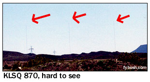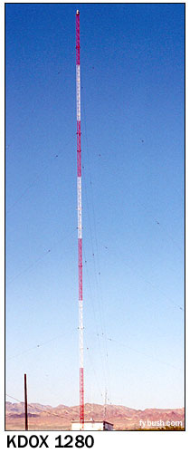 This single stick off Lake Mead Drive isn't much to look at, to be sure, but from here you can look to the northwest and see the three towers of Las Vegas' only fulltime 50,000-watt station. KDWN (720) signed on in 1975, in the first wave of the breakup of the clear channels. With a nondirectional signal by day and a directional signal at night to protect WGN in Chicago, it's been widely heard by DXers ever since. It's notable for three things: its talk hosts, who are so far to the right it's a wonder they haven't fallen off the edge of the flat earth; its Monday-morning silent period, which continued until just this year and its overnight host, a fellow named Art Bell who does the show from his home in nearby Pahrump. You've heard of him, maybe?