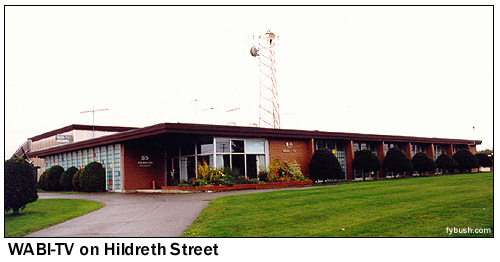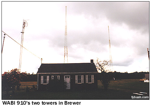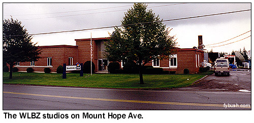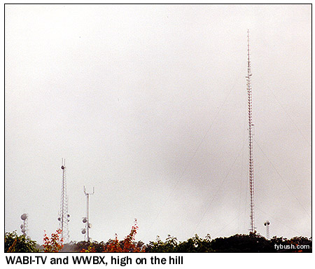 Follow Broadway back into downtown, head over the Penobscot Bridge and you're in Brewer, Maine, where we find Bangor's other remaining AM station. WABI, with transmitter out on Route 1A in Brewer, is the oldest radio station in Bangor, having signed on in 1924. It's also five kilowatts day and night, with a nighttime directional pattern that sends most of the signal north and west, away from Bangor. (Even so, WABI is widely heard by DXers in the Northeast.) When we visited, WABI had just recently been sold by the Hildreth family, which had owned it and its sister FM and TV outlets for decades. We'll see WABI-TV in a moment; first, we'll head back into Bangor and over to the city's east side to see the WLBZ studios on Mount Hope Avenue. This building is now a little emptier than it used to be; much of WLBZ's programming, including most of its weekend and morning newscasts, comes from sister station WCSH (Channel 6) down in Portland. (If you see "NewsCenter" without an identifying channel number, you're usually seeing Portland programming on Channel 2!)