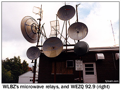 The gate leading up to Hog Hill was closed; our picture of WLBZ, then, comes from a distance. (That telephoto lens sure came in handy!) Nearby Copeland Hill is home to WBGR-CA (Channel 33), which provides Pax programming to Bangor; WKIT has its tower a few miles south of here. So we've seen all of the Bangor market, right? Not hardly - by the time we arrived six years ago, there had been significant FM move-in action. From Belfast, WWFX (104.7) was playing to the Bangor market (it became WBFB, country "Bear," the week after our visit); Old Town, just north of Bangor, had recently gotten a new C2 facility, WBZN (107.3); and the once-separate Ellsworth and Bar Harbor markets to the south and east were making their inroads into Bangor listenership as well. We didn't get down there on this 1996 trip, so we'll save all of those stations for a future Site of the Week. Stay tuned...