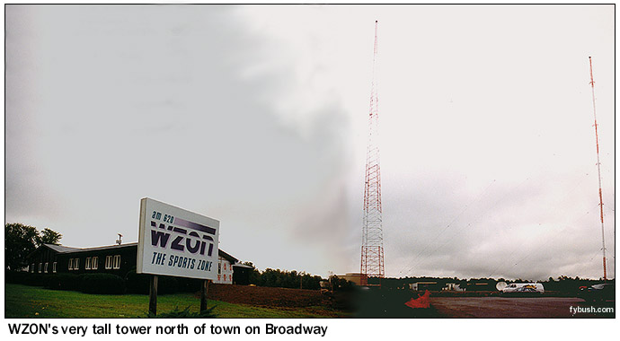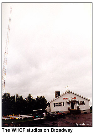 Long before you get there, though, you get to 861 Broadway, home of King's radio stations. WZON (620) is the descendant of Bangor's second-oldest radio station, WLBZ, which dates its legacy all the way back to the twenties. For most of its history, WLBZ was co-owned with Portland's WCSH under the Rines family's Maine Broadcasting System. MBS launched WCSH-TV in Portland and WLBZ-TV in Bangor to go with the radio stations in the fifties; three decades later, the radio stations would be sold off separately. WLBZ(AM) became WACZ in March, 1981, playing rock as "Z-62." Two years later, King bought the station and renamed it WZON, still playing rock. Since then, King has sold the station and bought it back, and today it's the sports station for Bangor and northern Maine. The FCC database puts the tall self-supporter in the middle of the picture at just under 400 feet; it certainly seemed taller when we were looking at it. In any case, that's the day tower; at night, WZON puts most of its power north, still running 5 kilowatts. The building was being renovated when we saw it; today, we believe it houses not only WZON but also rocker WKIT (100.3 Brewer) and King's latest acquisition, WDME (103.1 Dover-Foxcroft). Just up Broadway, at number 1476, is the studio of religious WHCF (88.5) and Christian contemporary WHMX (105.7 Howland); the transmitters for both are north of town (just enough north of the 45th parallel to be in the FCC's "Zone II," where WHCF can be a full class C station instead of class B.)