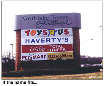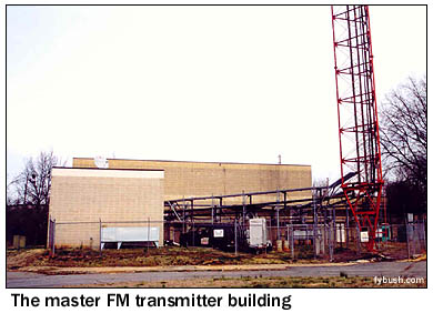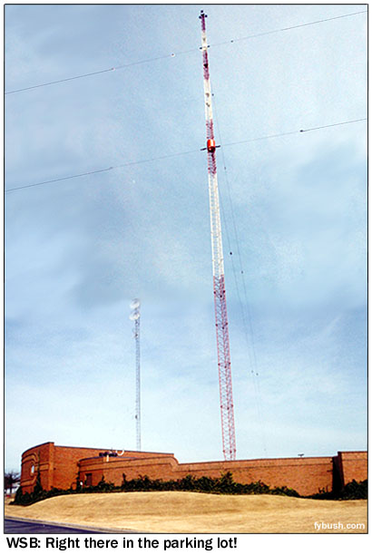 of that massive New World shakeup in the mid-nineties. From here, it's just two miles or so east to the spot where Lavista Road and Briarcliff Road come together, in a land of shopping centers and strip malls surrounding the interchange of I-85 and the Perimeter freeway, I-285. This was rural land just a decade or two ago, and it was "way the heck out of town" when WSB planted its mighty 50 kilowatts here. ![]() But rather than move, WSB stayed right where it was while the freeways and shopping centers moved in. And so it was that the open farmland that surrounded the WSB tower ended up covered in the asphalt of a parking lot, with a Toys "R" Us and an OfficeMax perched at the ends of the guy wires. Yes, my friends, today you will find WSB's tower at the center of the aptly named "Northlake Tower Festival" shopping plaza! You'll park under the guy wires - you have no choice, since they stretch over the entire parking area - and walk over to the big circular brick wall that surrounds the big square-faced tower to pay your respects to the most powerful AM signal in this land of poor ground conductivity. (WSB's daytime signal barely reaches west to the Alabama border or north to the Tennessee line, a far cry from the big groundwaves out in the midwest!) Where's the transmitter? Carefully concealed, as it happens: look at the left side of the photomontage above, and you can see how the existing transmitter building was incorporated into that big round brick wall. WSB's auxiliary tower holds the STL dishes that point back to the studios on West Peachtree; we're told the ground system is tied into the shopping plaza buildings, which are faced with brick that complements the WSB fortress.