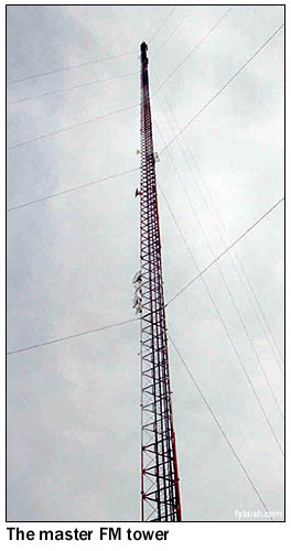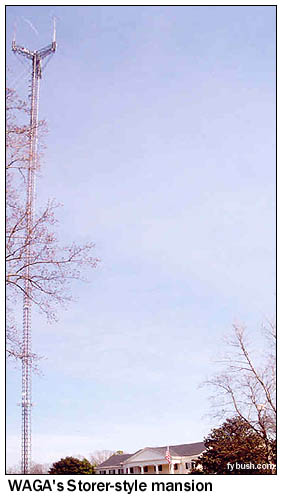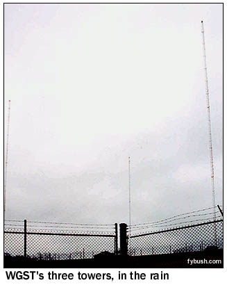 By day, WGST is a fairly decent signal, pushing 50 kilowatts out of two towers in a pattern aimed mainly south; by night, though, WGST runs just a kilowatt from two towers aimed east at downtown Atlanta, completely missing most of suburbia in the process. Jacor's successor, Clear Channel, has tried to boost WGST's reach with FM simulcasts over the years (including a WGST-FM on 105.7 up in far northeast Canton, Georgia, since evolved into "Mix" WMXV but still carrying Art Bell overnight as a relic of the old days), but it's still a far cry from the big gun up the dial on 750. A mile or so to the west is the four-tower array of one of Atlanta's original urban voices, WAOK (1380), now doing black-oriented talk under Infinity ownership. WAOK has an expanded-band CP (for WAZJ on 1650) that's never been built, and the station seems to be in no hurry to get WAZJ on the air. And as we head west in the pouring rain on I-20, we can say with pride that in less than 48 hours we've seen most of the radio and TV Atlanta has to offer, missing only some suburban rimshotter AM and FM signals, the Stone Mountain site of public TV WGTV (Channel 8) and public radio WABE (90.1), and one old-line Atlanta signal, the 590 that was once top-40 flamethrower WPLO and is now Radio Disney WDWD, operating from a new site west of town that we just didn't make it to in the rain. What did we see after we crossed the Alabama line? Check back next week and we'll show you Anniston, Birmingham and more...