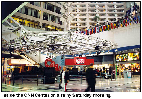 Saturday morning dawns gray and drizzly, but we have a couple of hours to kill before we need to leave for Birmingham, our next destination, so we head back downtown to see about getting on a CNN studio tour. It turns out reservations are a must here (even for a former AOL-Time Warner employee, alas), so we spend a few minutes admiring the inside of CNN Center (the spot at left is where they do TalkBack Live, or whatever it's called this week; the whole place is a former Sid and Marty Krofft theme park, turned hotel, turned international news facility) before setting out to ride the MARTA rapid transit line a few stops and heading back out in the pouring rain, past the state capital, the Martin Luther King gravesite, and west on I-20 towards the Alabama state line. Just a couple of stops remain before we cross the line into Alabama: two more Atlanta AMs on the west side of town.