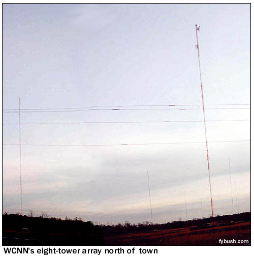 An office park just northeast of the interchange where 400 meets the Perimeter, Roddy pointed out, is crowned with the antenna bays of one of the many Atlanta-area FM move-ins that have helped alleviate the shortage of FM signals in town in recent years. This one is smooth jazz WJZZ (107.5), licensed to Roswell and owned by Radio One, which now has something like four FM signals serving portions of the Atlanta market. Heading east through land that was recently woods and is now suburban housing and strip malls, we soon arrived at a big eight-tower array, WCNN (680), licensed to North Atlanta (which doesn't actually exist in any sort of incorporated sense). No, it's not owned by Ted Turner; the Atlanta-appropriate calls come from a long-ago simulcast of CNN Headline News and just never changed through a succession of formats since. Today, WCNN does sports and is owned by Dickey Broadcasting (the same family that runs Cumulus, in fact!) WCNN's day signal isn't bad, with just two towers sending 50 kilowatts in a broad lobe south towards town; at night, it's 10 kilowatts from all eight towers, in a narrow beam aimed south-southwest into Atlanta, but missing much of the fast-growing suburban area north, east and west of the city. (Back when the 680 signal was a daytimer, it used the WNIV/WGKA stick on Cheshire Bridge Road that we saw in last week's installment.)