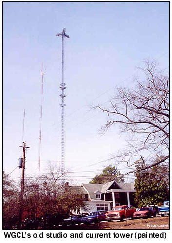 But before we reached that site (and don't worry, we will get there), there was some interesting TV to see, just around the corner from those AM sites on Cheshire Bridge Road where we ended Part One. Less than half a mile away (clearly visible, in fact, from the AM sites) rise several candelabra towers, on either side of Briarcliff Road. On the west side, a tall painted stick carries WGCL (Channel 46), WATL (Channel 36), and several FM stations (WPCH 94.9, WKLS 96.1 and WKHX 101.5). A new candelabra next door is being built for DTV purposes. That house you see in the foreground of the WGCL picture was the channel 46 studio until last year; we hear it's now being used as a synagogue! Just across Briarcliff Road and south a few hundred yards