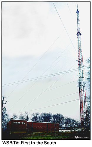 From WXIA, we can look northwest a few hundred feet to another tallish tower, which carries several Atlanta FMs and public television WPBA (Channel 30). WSTR (94.1, the old WQXI-FM), WSB-FM (98.5) and WVEE (103.3) all call this master site home. We're also not far from the new tower that will be home to WUPA's digital signal when the UPN affiliate gets on the air with DTV. WUPA apparently plans to move its channel 69 analog signal over here as well, when the time comes. And less than a mile to the northwest is the oldest TV site in Atlanta - and anywhere in the South, for that matter: WSB-TV's stubby little channel 2 tower, on a rise of land that overlooks downtown Atlanta. The station has been here since day one, September 29, 1948, when it was an NBC affiliate and operating on channel 8. The channel changed in 1952, when WSB's owner, Cox, acquired the Atlanta Constitution and its unbuilt construction permit for WCON on channel 2; the network affiliation changed to ABC in 1980; the ratings stayed in first place all along.