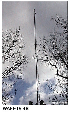 Before we even made the turn to Monte Sano Boulevard, we saw the immensely tall stick of Huntsville's NBC station, WAFF (Channel 48), behind a big gate and down a little driveway along the southern slope of the mountain. The FCC actually lacks a record showing how high above ground this tower stands, but extrapolating from the WAFF-DT (Channel 49) records shows that we're dealing with more than 450 meters of steel here.