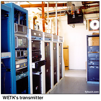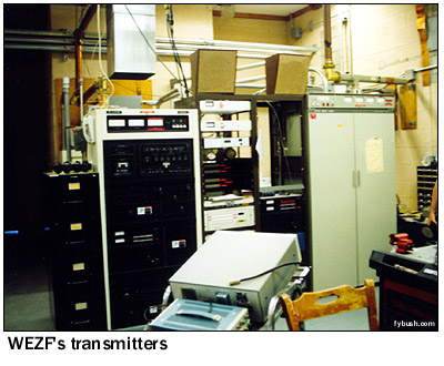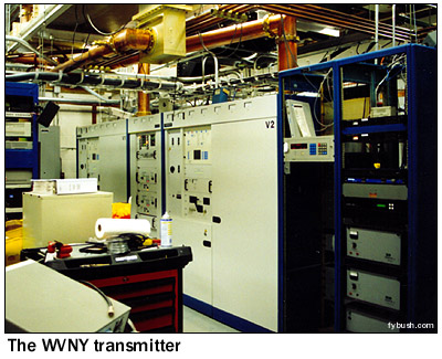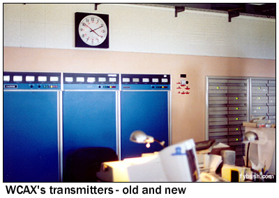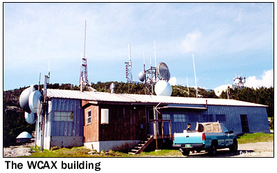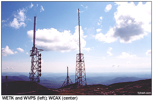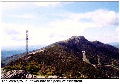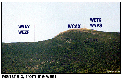 In any event, WCAX had the mountaintop to itself for its first 13 years on the air, even as the slopes of the hill below began to get crowded with the increasing popularity of the Stowe and Smuggler's Notch ski areas. (In fact, the Mount Mansfield Auto Road, open to the public as a toll road during the summer, doubles as a ski run during the winter, with WCAX staffers using a Sno-Cat to head up the mountain to trade shifts at the transmitter building.) On October 16, 1967, Mansfield doubled its TV population with the debut of WETK, channel 33, the first station of what would eventually be known as "Vermont ETV" and later as "Vermont Public Television." Channel 33 built a tower of its own on the "nose," right next to the WCAX tower, with a transmission line leading down the slope of the hill to a transmitter building just above the WCAX facility. (In the photo above, the WCAX tower is the leftmost one on the hill, with WETK just to the right. You can see the WETK transmitter building at the very right of the picture, nestled in the trees above the WCAX building.) ![]() The following summer saw the construction of a new tower on the mountain, this one down lower in the little notch that separates the "nose" and "chin," where the visitor's center now greets visitors at the end of the public portion of the auto road. While the new tower was down a bit lower, it was built taller than the WCAX and WETK towers and heavily guyed against winter storms. On August 19, 1968, the new tower signed on with ABC programming as WVNY-TV, the calls standing for "Vermont" and "New York," the two states that made up the Burlington/Plattsburgh TV market (WCAX handled CBS programming; NBC came from the New York side via WPTZ Channel 5, licensed to North Pole and later to Plattsburgh.) One summer later, FM radio came to the mountaintop with the debut of WVNY(FM) on 92.9, which signed on July 19, 1969, just in time to announce the moon landing. While Burlington had had FM radio since 1962, the existing stations (WJOY-FM on 98.9, now WOKO, and the University of Vermont's WRUV on 90.1) were down in the lowlands near the lake, with low power that just covered Burlington and vicinity. The 92.9 signal, with 36 kilowatts from 2700 feet above average terrain, covered most of Vermont and good chunks of Quebec, New York and New Hampshire to boot, and remains the best FM signal in northern Vermont, and perhaps in the entire state, to this day. ![]() The last station to arrive on the mountaintop - for now, anyway - debuted on October 15, 1980. WVPS(FM), on 107.9 with 36 kilowatts, represented a huge leap forward for fledgling Vermont Public Radio, which had been on the air for three years by then (this week, in fact, marks the network's 25th anniversary), but only on the WVPR 89.5 Windsor signal that reaches the eastern parts of Vermont. Just as 92.9 (by then WEZF, matching the changed calls on WEZF-TV 22) had used the existing channel 22 tower, WVPS became a tenant on the channel 33 tower; you can see its six bays on the left-hand tower in the photo above. WVPS eventually boosted power to 49 kW, just as WEZF boosted its power to 46 kW; while both have excellent signals, WEZF's location higher above the mountaintop on a panel antenna eliminates some reflections and multipath problems that WVPS suffers on its lower side-mounted antenna. ![]() ![]() A visit to the mountain today begins at the end of the road at the visitor's center - but not in front! Walk around the side, and if you're lucky (as we were during a mid-June visit) the engineers from channel 22 will be around to welcome you into their transmitter room at the rear of the building. As you can see from the photos above, channel 22 and FM 92.9 still share a transmitter room, even though the stations are no longer co-owned. Channel 22 has reverted to the WVNY calls, while 92.9, still WEZF, is a Clear Channel outlet doing an AC format as "Star 92.9." The old Gates on the right of the WEZF-FM photo is probably the original 92.9 transmitter, long since replaced by the newer Harris; the Comark transmitter WVNY uses is most certainly not the original channel 22 transmitter from three decades ago!