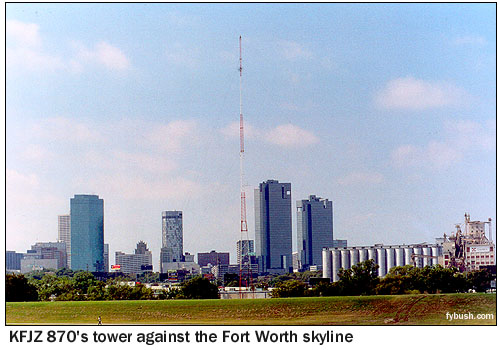 single stick of KFJZ (870) against the downtown skyline a mile
