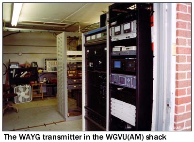 This little class A facility shares a transmitter site out on 68th Street east of Kalamazoo Avenue with public radio WGVU (1480), the descendant of the old WMAX radio, now owned by Grand Valley State University. WGVU's 5 kW BE transmitter is tucked behind the WAYG racks shown here; that's WAYG's Harris transmitter at the center of the picture. WAYG's antenna consists of two bays hung on one of the four WGVU towers, which I somehow missed photographing. (Again, check out Tom's site to see them, as well as the other pieces of both the WGVU broadcast empire - another AM, an FM and two TV stations - and WAYG's sister station in Kalamazoo, WAYK 88.3.)