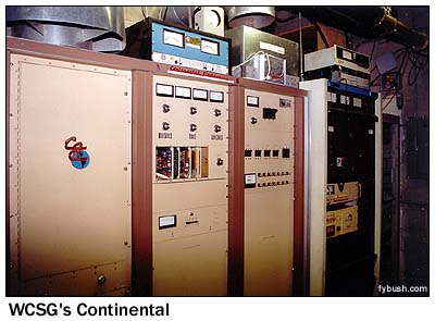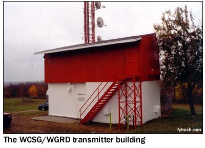 Like so many early FM stations, WFRS soon fell silent, but its tower still stands, now used for ham repeaters and two-way communications. Right next door to the old WFRS tower is a tower that's used by two present-day Grand Rapids FM stations: rocker WGRD (97.9) and contemporary Christian WCSG (91.3), whose chief engineer, Tom Bosscher, is our host this day (as well as the proprietor of the excellent Michigan Broadcast Towers pages). That may look like a sizable transmitter building below, but both WCSG and WGRD share a small room behind the white door at the foot of the stairs, with the rest of the building used for non-broadcast purposes. I had to stand with my back against the corner of WGRD's transmitter to get even as much of WCSG's in the picture as I did! WGRD uses two bays at the very top of the tower; WCSG's four directional bays are right below WGRD's, and I'm afraid neither is very easy to see in this picture. (Visit Tom's page for some better ones - you can also see the old WCSG aux transmitter that's been replaced in this picture by a newer Harris.)