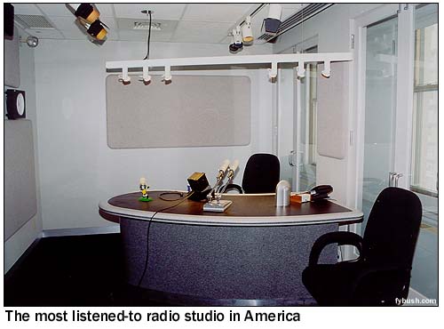 But when Mr. Harvey sits down and, on the cue from his engineer (out of frame through a window to the left of the clock), launches into "Hello, Americans...", there are few experiences that can compare to being in the studio when the master is practicing his art. I think I may have breathed once or twice during the 15-minute midday newscast (fed from here at 10:35 AM CT), but it's hard to remember in all the excitement.