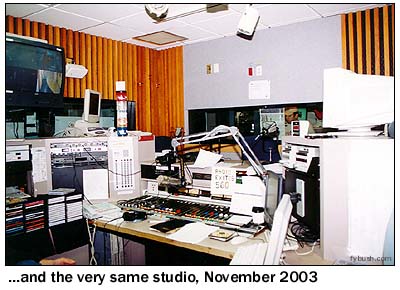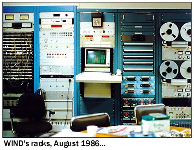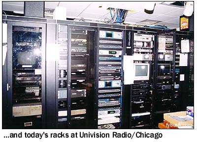 I'm somewhat more certain that the room in the middle of this long hallway where I photographed the guts of the WIND technical operation, circa 1986, is the same one that's still home to the guts of Univision Radio in 2003. Of course, the nature of those guts has changed immensely in two decades - there were no servers, ISDN codecs, digital processors or EAS boxes in 1986 - and there's certainly no reel-to-reel logging or spaghetti patch panel to be seen now. (And any former Westinghouse all-news radio staffer, like your editor, knows exactly what those car radios are doing in the rack second from right in the 1986 photo - they're the air monitors feeding the all-important competition to the editor's desk in the newsroom! Back then, they'd almost certainly have been tuned to WMAQ 670, WGN 720, WBBM 780, WLS 890, WCFL 1000 and WJJD 1160.)