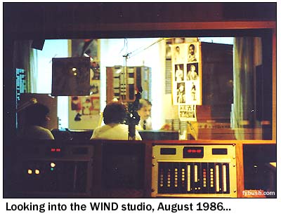 At left is another photo snapped during my 1986 visit, of a room that I have marked in my photo album as "newsroom." I'm not sure that's really what it was (the newsroom from the Westinghouse all-news era is now a promotions office at the end of the hallway that holds all the Univision Radio studios) - in all likelihood, this is actually the room that's now, after much renovation, the studio for WRTO. Or perhaps it's the studio at the other end of the hall that's now "La Que Buena" WOJO (105.1 Evanston), the legacy Spanish-language FM that was still operating separately from WIND in 1986, with studios on Main Street up in Evanston itself. I think it's the former, but so much has changed in 17 years that it's hard to tell.