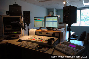 As the flagship station of the cluster, WIKY gets to have its studio in a place of pride, behind windows right off the main lobby. Leading back from the WIKY studio, there’s a long hallway with a nice conference room (including some details salvaged from the 1981 fire) heading back to the other stations’ studios.