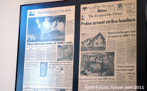 Plenty changed here over the years: in 1981, the Engelbrechts bought longtime, full-time AM competitor WROZ (1400, ex-WEOA), which in those one-to-an-owner days meant that the AM 820 signal had to be spun off. As we saw last week, 820 moved out to the University of Southern Indiana to make room for the new AM on the hill. But no sooner had WROZ moved in than disaster struck: a fire just after Christmas in 1981 ripped through the building, knocking WIKY off the air until an emergency studio could be rigged up in a mobile unit outside.