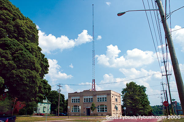 WJTN, which was doing news and talk then (and still is now), had its tower on Jones and Gifford Road, west of downtown in the swampland at the south end of Chautauqua Lake. But this little flagpole-style tower is hardly the highlight of this pair of stations. To see that, you have to head southwest from Jamestown into the town of Busti and up the hill to Orchard Street.