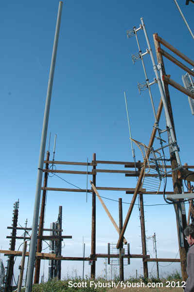 I believe that’s KRRF’s three-bay Shively , with lots of beam tilt, hanging off the “matrix” in the photo above at left. I’m pretty sure KQSC’s four-bay antenna is in the middle in the photo above at right, and I think KJEE and KSBX are in this picture, too.