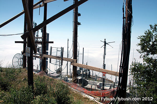 Several FM antennas on very short towers line the edge of the roadway leading down to that lower building, hanging almost off the edge of the cliff.
