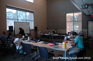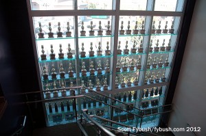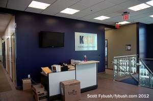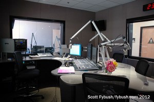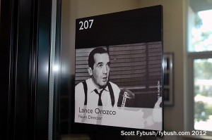 Actor Larry Hagman and his wife, Maj, who lived nearby in Ojai, led the fundraising campaign f0r the new building; when we stopped by in April 2012, GM Mary Olson was leading one of the first membership drives out of the new community room that dominates the first floor of the facility. When this atrium space isn’t filled with phone banks, it’s used for all sorts of community events and meetings. It opens into a lounge area that in turn leads to the stairway up to the second-floor lobby – and that stairway is lined with a very impressive array of awards for such a young station.