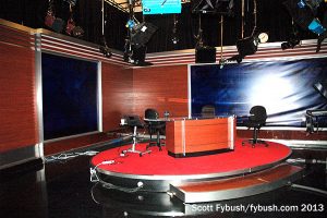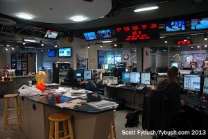 The famed “Glass Enclosed Nerve Center” studios here had been renovated since our last visit, and the model established here – newsroom with editor’s desk at the front facing a mirror-image pair of air studios through floor-to-ceiling glass walls – has become standard for most all-news studio buildouts in recent years, including New York’s WCBS and Chicago’s WBBM.