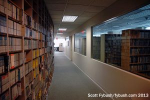 WETA-FM (90.9) jumped back to all-classical when Bonneville pulled the plug on commercial classical WGMS (those calls now reside on WETA’s 89.1 relay signal up in Hagerstown, Maryland, formerly WETH), and its announcers occupy a large studio with big windows looking out at Shirlington. That Studer console was on its way out when we visited, so this is actually a “before” picture for an “after” visit we’ll have to make next time we’re in town. There’s a big music library just down the hall, some of it donated by WGMS when it went away.