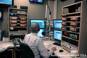 That’s one of the mirror-image air studios above at left, and next to the studios is the new traffic center where the legendary Bob Marbourg and his colleagues ply their trade in one of the most traffic-choked markets in America. (How serious is Marbourg about what he does? So much so that he covered up some of the open windows on his computer screens so we couldn’t photograph the specific sites and services from which he’s getting some of his proprietary information!)