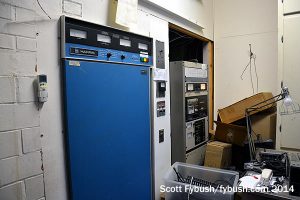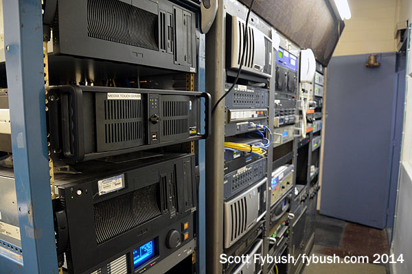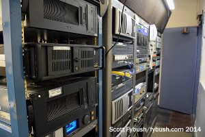 The tech core is right at the heart of the building, straight back from the lobby as you walk in, with the audio networking, STL, processing, IT and other gear in a long row of racks leading back to the Harris MW-1 in back and the newer BE kilowatt rig that now powers WHDL.