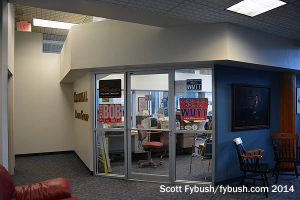 The studio core sits next to the tech room, and here you can see those spiffy (and remarkably compact!) Logitek consoles in action. At left above is the studio for WHDL, which runs mostly satellite sports these days as an ESPN affiliate (the calls now stand for “The Huddle”); at right is former afternoon jock Brad Majors on WPIG, “Sizzlin’ Country,” which has long been the dominant FM voice in the market from its class B facility up in the hills south of town along Route 16.