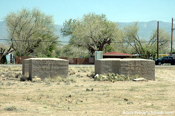And that brings us out to the towers. The 645-foot daytime tower just north of the transmitter building goes almost all the way back to 1941, while the 443-foot tower to the west is a more recent addition; I believe it went up in 1985 when KOB upgraded to 50 kW nighttime power. (The bases for an earlier tower can still be seen to the northeast of the transmitter building, as well as above at right.)