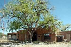 The 1941-vintage adobe-style transmitter building is still here, complete with most of the original lightning-bolt “KOB” logo that adorned the doorway. A visitor in 1941 would have walked inside to be confronted by the RCA 50E transmitter filling most of a wall; it was supplanted three decades later by a Harris MW50 transmitter to the right of the doorway, which is still there as a backup.