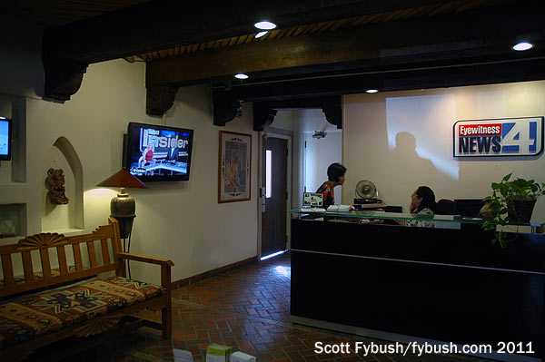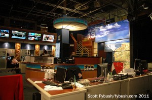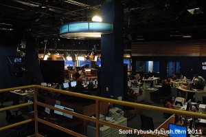 The spacious two-story newsroom is toward the back of the building in a newer addition. KOB, like its Albuquerque competitors, covers nearly all of this enormous state, and then some. It has full-power relays to the northwest in Farmington (KOBF-TV 12) and to the southeast in Roswell (KOBR-TV 8), and in the analog days it also had KOBG-TV in Silver City, to the southwest. Once upon a time, those stations had their own local newsrooms doing inserts to KOB’s Albuquerque-based newscasts, but today they’re just bases for local reporters feeding news back to the newsroom here in Albuquerque.