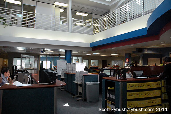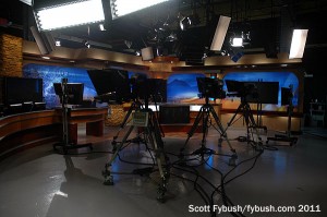 So instead, what we have here is the original 1950s-era building, now mostly occupied by sales and programming offices, and that big addition that’s now home to a two-story newsroom/studio combination and a new control room that allowed KRQE to become the market’s first station producing local news in HD.