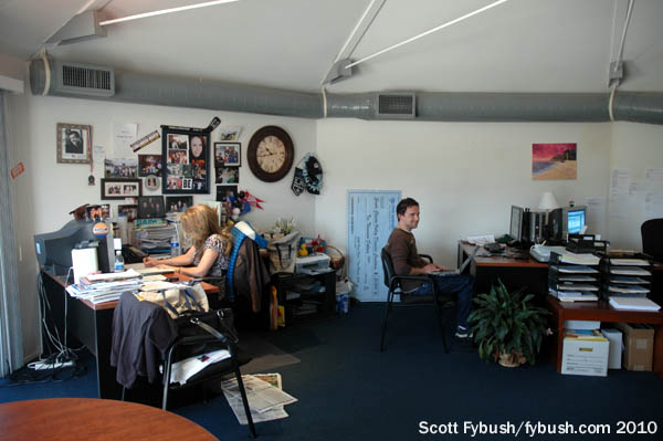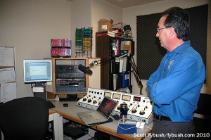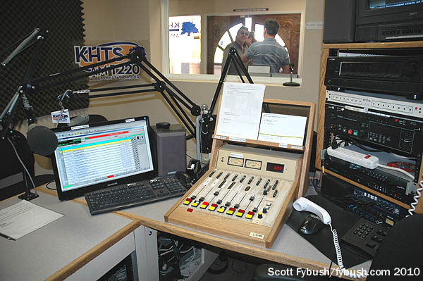 There’s a steady stream of people passing through the little lobby here, as there should be – and just as there should be, there’s a studio window (seen in the photo at top right) looking out into the lobby. This is one of two studios here in the facility – the other, shown above at left, is a production room – and while neither is especially fancy, they work just fine for the KHTS format, which mixes lots of local talk and sports with AC music.