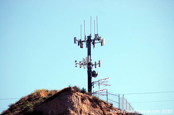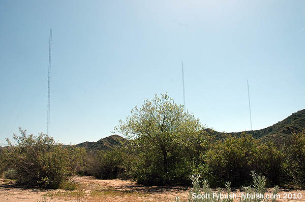 We noted at the start of this week’s installment that the valley is well shielded from FM signals from the Los Angeles market, and that’s been a growing concern for LA broadcasters as the population up here has grown, seeing as how the valley is very much part of the Arbitron market. They’ve been trying to rectify the problem with boosters and translators, and now the valley is served by on-channel boosters for public stations KPCC (89.3) and KUSC (91.5) as well as for Spanish-language KXOS (93.9) and KBUA (94.3), Saul Levine’s KKGO (105.1) and CBS Radio’s KROQ (106.7) and a translator (K261AB 100.1) for Bonneville’s KSWD (100.3). Most of these low-power signals aim north into the valley from either the Santa Susana Mountains to the southwest or the San Gabriel Mountains to the southeast; the exception is KXOS-1 on 93.9, which we spotted just below those cellular antennas on a little ridge near the middle of the valley.