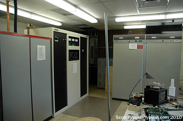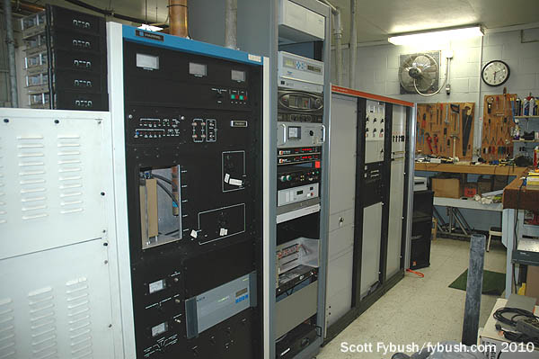 On one side of the room is the Rockwell-Collins phasor and the main Harris DX10 transmitter; that’s an older MW5 aux around the corner, facing the wall of racks on the other side.
