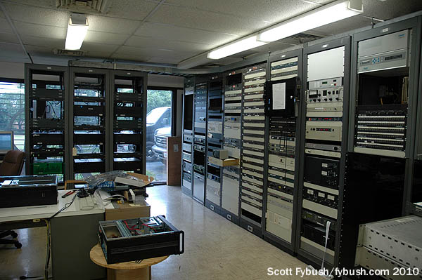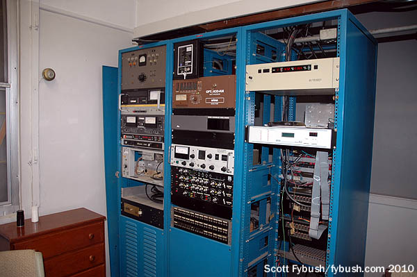 About that building: it’s a nice piece of 1970s-vintage radio architecture, with lots of skylights upstairs and a somewhat unusual rack room setup downstairs: how many transmitter rooms have a nice wall of glass doors leading out to the back parking lot and the towers?