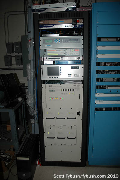 Licensed to Franklin College in nearby Franklin, WFCI runs 1150 watts from this vertical-only antenna (protecting the old analog channel 6 WRTV signal), and these days most of its airtime is used to simulcast public station WFYI (90.1 Indianapolis), though Franklin College students are on the air at night and on weekends. And yes, that Gates transmitter – still WFCI’s main and only transmitter – is original to this site from more than 40 years back.