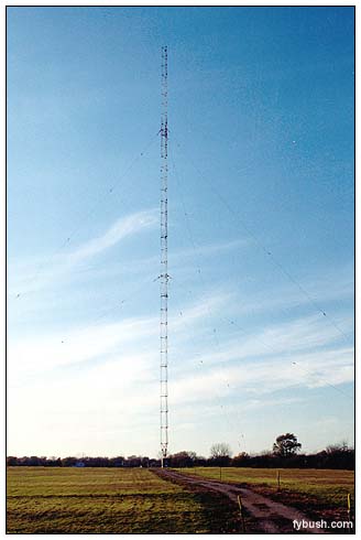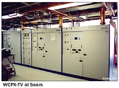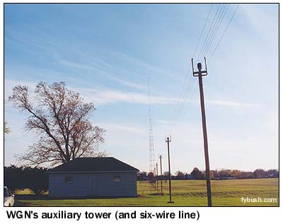 In addition to the main tower, WGN has an auxiliary tower at the south end of the property. Yup - that's old-school six-wire open transmission line heading out to the 250-foot self-supporting tower, but it's just there for decoration these days, having been replaced by more conventional buried transmission line. And look carefully at the STL tower above at right: though it's hard to see in this picture, that's a folded unipole antenna mounted on that tower to provide yet another worst-case transmission option.