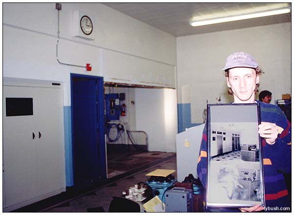 The main entrance to the transmitter these days is through the back door, which opens to the space behind the transmitters. At left in the photo above is the Harris DX50 that's been WGN's main transmitter. At center is the space where the Continental was and where the 3DX50 was going. And at right is our Indiana RadioWatch colleague Blaine Thompson holding up one of the site's prized artifacts: a photo showing the same room from the same spot back in the late thirties. That was a homebrew 50kW transmitter in the space where the Continental would later sit - and that's still the same clock on the wall and the same linoleum on the floor!