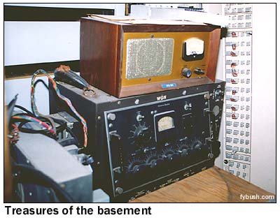 But the real treat is to be found in the main room in the basement, once home to the mighty power transformers that drove the old tube transmitters and now full of gear that's no longer needed downtown but is too interesting to be thrown away. That box above at left looks like an old mixing board for remote broadcasts - and those are two transcription lathes up against the wall in the photo at right.