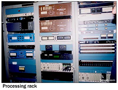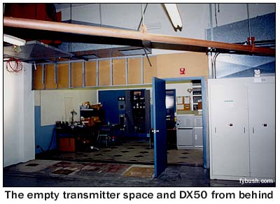 STL gear and transmitter control equipment sits in the center of the room, where engineers would once have worked around the clock supervising the transmitters; audio processing and more STL equipment sits in a rack in a room off the main transmitter area.