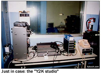Next to those racks sits a folding table with some basic equipment - a simple mixing board, several cart machines, a cassette deck and two reel-to-reels. This is WGN's so-called "Y2K studio," assembled here in late 1999...just in case.