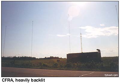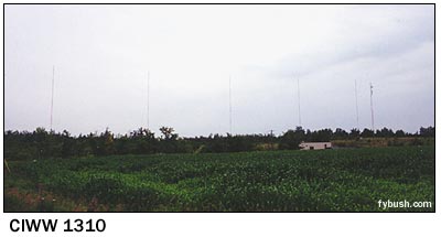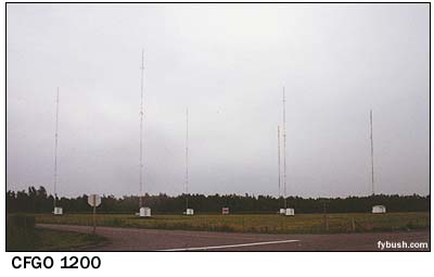 Now that we've moved pretty far south of Ottawa, we've reached the land of AM arrays. With the exception of the defunct CKCH (970 Hull), all of the market's AM signals have always come from the south and beamed north, in classic Canadian fashion. CFGO (1440, later 1200) was once the closest in to the city, at Woodroffe and Greenbank Roads, but in the eighties it relocated a few miles to the south, where it now occupies a six-tower array near the old Highway 16. Not far away are the five towers (two for day use, all five at night) of CIWW on 1310, the former CKOY, one of the more widely-heard Ottawa signals at night.