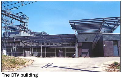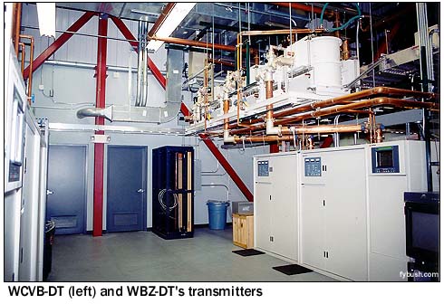 All those new signals needed lots of space for transmitters, and Viacom's solution was to build a big (30,000 square feet, if memory serves) common facility to house them all, complete with high ceilings to accommodate all the filtering and combining that's needed in such a master-antenna setup. As you walk into the building, you see first the WCVB-DT Harris Sigma CD transmitter, then its identical twin just a few feet away for WBZ-DT. (The space at the right of the WBZ-DT transmitter is now occupied by a very early Sony HDTV monitor; eventually, a third power amplifier cabinet will go here to provide some redundancy to the operation.)
