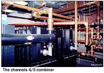 WBZ is powered by a Harris solid-state analog transmitter (one of the earliest generation of solid-state units, when the concept of hot-swappable amplification modules was still brand new), with a venerable RCA still in place as a backup. A small room attached to the back of the building once housed WBZ-FM (which left this site in 1981 when Westinghouse sold it; it's now WMJX and transmits from the Pru, as we saw two weeks ago) and is now home to the combiner (a Dielectric, I believe) that takes the WBZ-TV channel 4 and WCVB channel 5 signals and sends them up to the shared antenna.