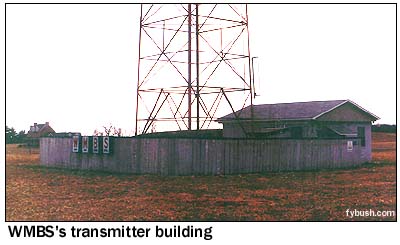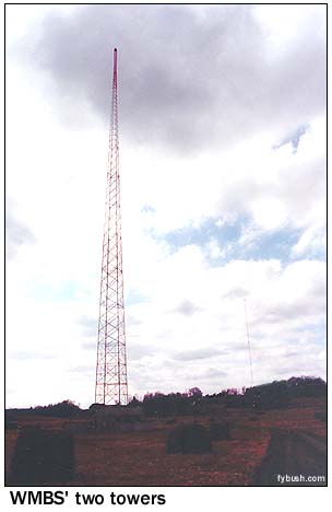 Clarke remembered an impressive "W M B S" sign outside the old studios, and any question about its fate went away when we drove south to PA 857 and the two-tower transmitter site; as you can see below, the sign was simply mounted on the transmitter fence! WMBS uses that big self-supporter all the time; it adds a little guyed tower to create the three-lobed night pattern.